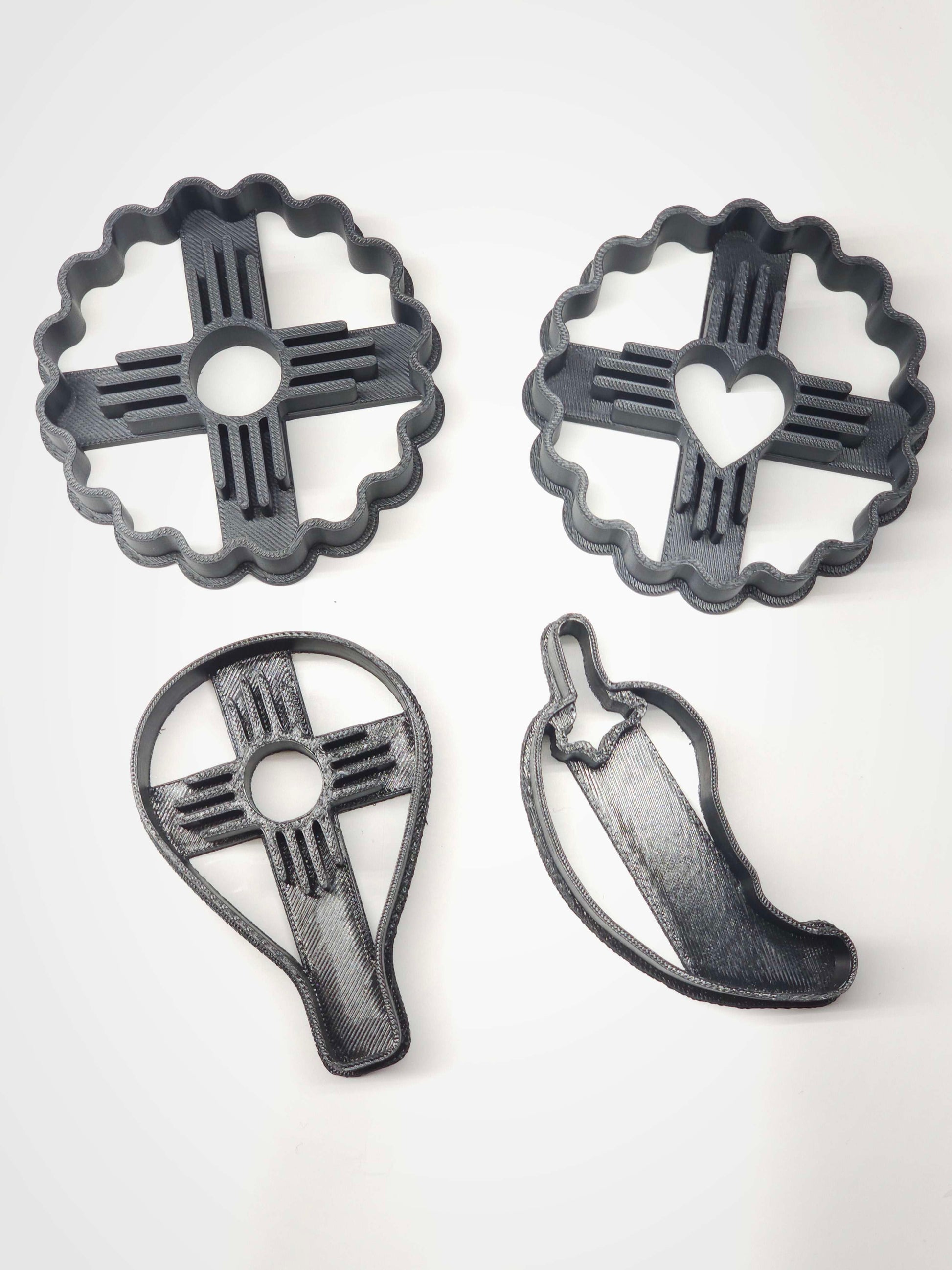 These are New Mexico theme cookie cutters manly used for biscochitos. These make 3 inch by 1/4 inch depth cookies.